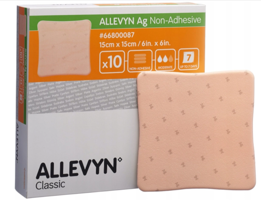 Allevyn Ag Non-Adhesive – nicht haftender Polyurethanschaumverband mit Silberpartikeln, geeignet für infizierte Wunden mit mäßigem bis starkem Exsudat. Steril.