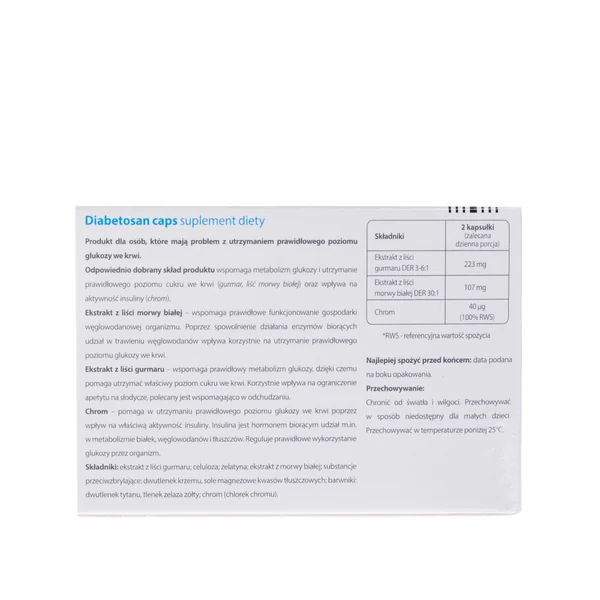 Diabetosan Caps ist ein Nahrungsergänzungsmittel mit natürlichen Pflanzenextrakten wie Blättern der Weißen Maulbeere und Gurmar, angereichert mit Chrom. Diese Inhaltsstoffe haben gesundheitsfördernde Eigenschaften und werden insbesondere Personen mit Störungen im Kohlenhydratstoffwechsel empfohlen. Das Produkt wurde von der Firma HERBAPOL LUBLIN unter Verwendung standardisierter und geprüfter Inhaltsstoffe höchster Qualität entwickelt.