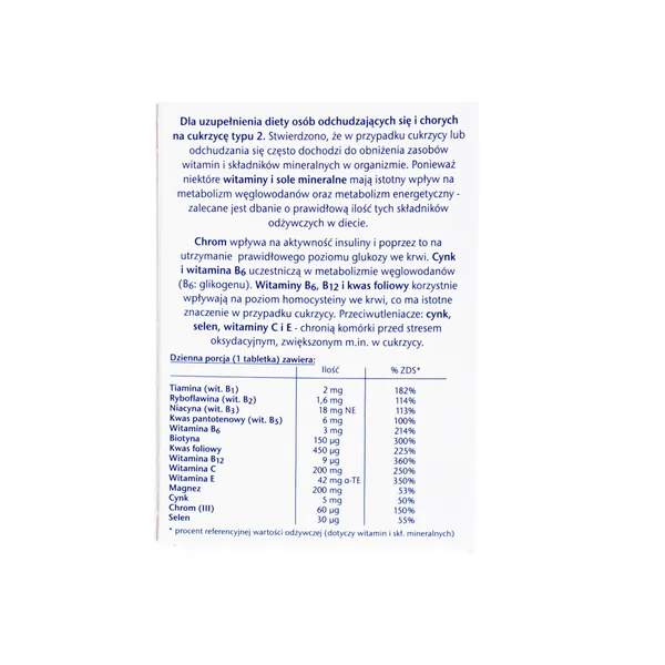 Das Präparat wurde speziell entwickelt, um die Ernährung von Personen mit Typ-2-Diabetes und Menschen, die abnehmen möchten, zu ergänzen. Studien zeigen, dass Diabetes häufig zu einem Rückgang von Vitaminen und Mineralstoffen im Körper führt. Da einige Vitamine und Mineralstoffe einen wesentlichen Einfluss auf den Kohlenhydrat- und Energiestoffwechsel haben, wird empfohlen, die diabetische Ernährung mit diesen Nährstoffen zu ergänzen.