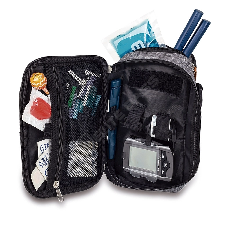 Isoliertasche für Diabeteszubehör, entwickelt, um alle für Diabetiker notwendigen Gegenstände unterzubringen. Die Aufteilung in zwei Fächer erleichtert die Aufbewahrung von Selbstkontrollgeräten (Blutzuckermessgerät, Lesegerät, Teststreifen, Nadeln) sowie Pens oder Ampullen, die in der isolierten Tasche Platz finden.