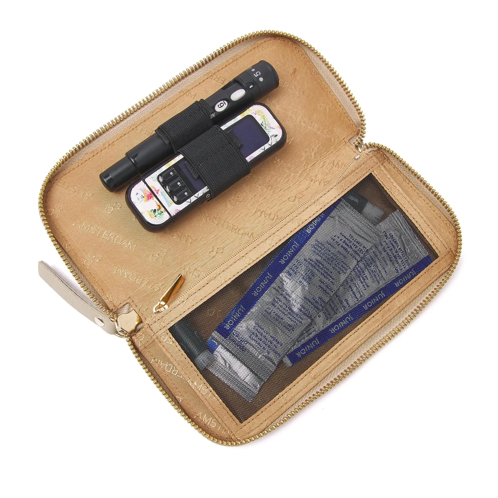 Im Inneren dieses Lederetuis gibt es viele Aufbewahrungsmöglichkeiten, einschließlich einer Reißverschlusstasche für lose Gegenstände sowie sichere Aufbewahrung mit elastischen Bändern für Lanzetten und Insulinpens. Darüber hinaus sorgt eine separate Stecktasche für noch mehr Stauraum.