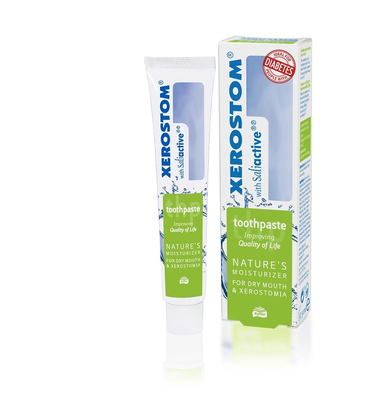 XEROSTOM ist eine Produktlinie für die Mundhygiene, die speziell für Menschen mit Mundtrockenheit (Xerostomie) entwickelt wurde. XEROSTOM regt die Speichelproduktion an, lindert Schmerzen im Zusammenhang mit Trockenheit und beruhigt Reizungen. Es schützt die Mundhöhle und die Zähne vor den Folgen der Xerostomie, wie z. B. Karies oder Pilzbefall. Besonders empfehlenswert für Diabetiker. Die XEROSTOM-Produktlinie umfasst: Zahnpasta, Gel, Mundspülung, Lutschtabletten, Spray und Zahnpflegekaugummis.